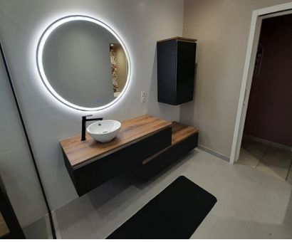 Tendance le noir et bois s’intègre parfaitement dans la salle de bain, ici avec le coloris noir mat en stratifié Fenix, les poignées profil en inox et le plan de travail en stratifié bois de grange.